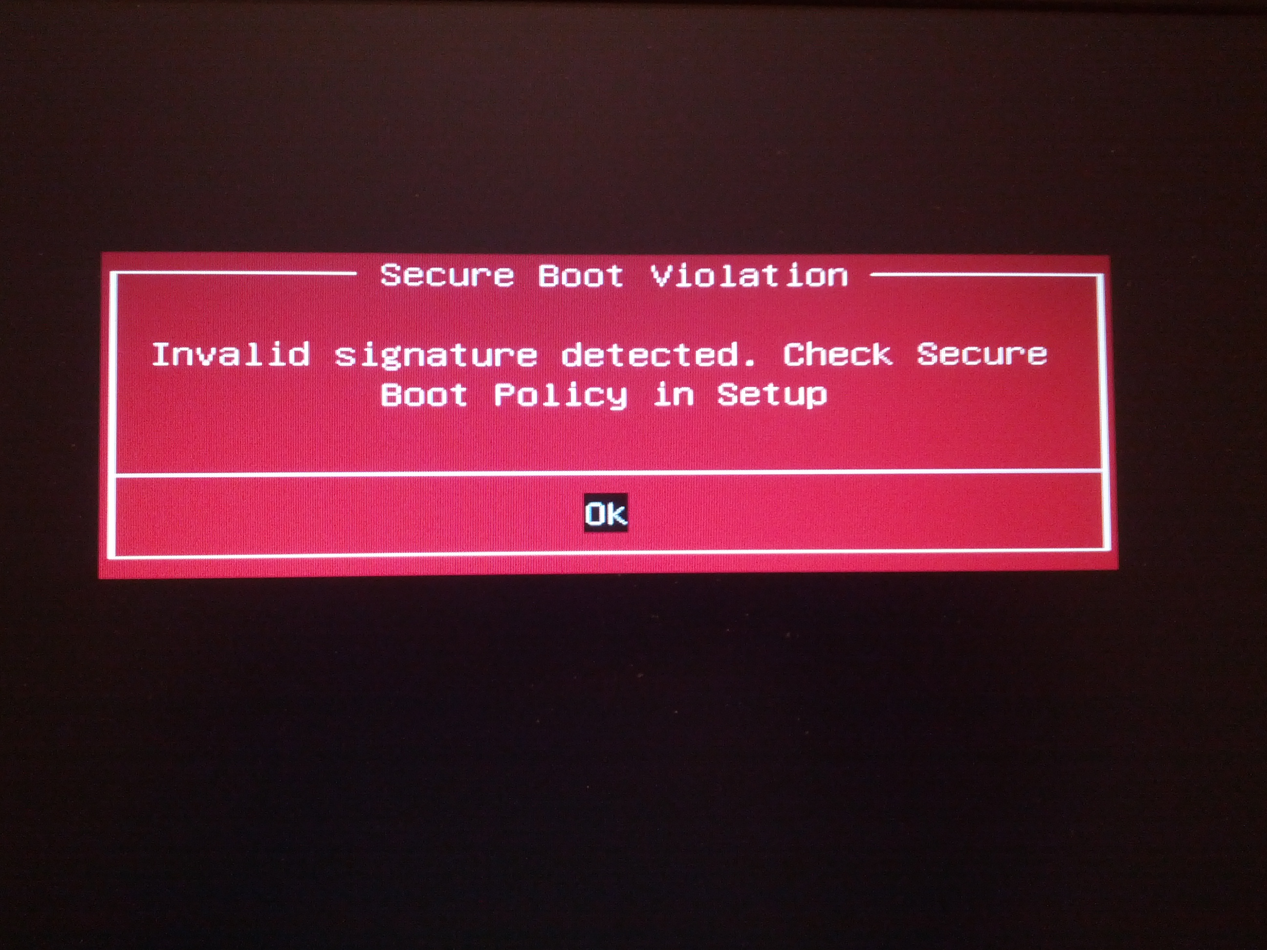 Secure Boot ViolationJust now, out of the blue moon, when I turned on my Asus G46VW gaming laptop, I got a "Secure Boot Violation" dialog. The full message is below: "Invalid signature detected. Check Secure Boot Policy in Setup" I haven't been able to get into BIOS setup yet. Either I forgot the function key or it is not letting me in. Windows 8 does boot up and run. So I am not sure what is going on. Jake Ok. I solved the problem by going into BIOS. i had to access BIOS the hard way: Boot up Windows 8, move mouse to upper right hand corner, select "Settings", select "Change PC settings", click "General", scroll down, click "Restart now" button under "Advanced startup", choose "Troubleshoot", choose "Advanced options", choose "UEFI Firmware Settings", then click the "Restart" button. What a chore it was. Who made the decision to make it so hard to enter the BIOS? Some how "Boot Options Priorities" shows the following: Boot Option #1: ubuntu That is funny, because my Ubuntu 13.04 installation is a VirtualBox virtual machine. How did its boot manager get onto the BIOS level? Anyway, swapping the boot priority (shown in the photo below solved the secure boot violation problem. Jake