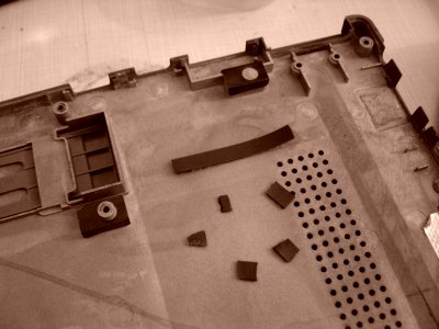 Using a Thicker Notebook Drive in the Intermec Norand Pen*Key 6642I've been taking the Intermec Norand Pen*Key 6642 tablet computer apart a lot lately, because I want to see how I can upgrade it. I've already max out the memory on it (see my post elsewhere on this site). Now I want to put a bigger hard drive in it. The problem is that Intermec Norand 6642 ships with a 8.5mm hard drive. The more popular 9.5mm hard drive wouldn't fit in it. And at this time, I can't find any places that seel 8.5mm notebook hard drives. Almost ready to give up the idea, I noticed that there is a rubber strip on the rear chassis (see photo below), where the hard drive would sit. I assume that the rubber strip is for damping the hard drive. Now, if I remove that strip of rubber, it's quite likely that I can fit a 9.5mm drive in the tablet computer. After a minute of pulling and tugging, the rubber strip finally came out. And a test fit of the chassis seems to indicate it will screw together without any gaps. Chieh Cheng After doing the test fit, I started peeling off the rubber strip on the hard drive mounting bracket (see below). The hard drive mounting bracket is made for 8.5mm drive, but it works ok with a 9.5mm drive. After putting the case together, it seems to be a perfect fit. Chieh Cheng