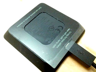 I placed Google LG Nexus 5 on top of it. The first thing I noticed is that the wireless charging block is magnetic. It sucks tightly to the bottom of the Nexus 5. That defeats the purpose of it being a wireless charger, because you'll have to grab the phone and the wireless charging block to take them apart. To give it some credit, the Nexus Wireless Charger has an adhesive bottom (see photo below). It is intended for you to fix it in place on your desk or on your wall. Then when you place the phone on it, it will be secure. And with one hand, you can pull the phone off.