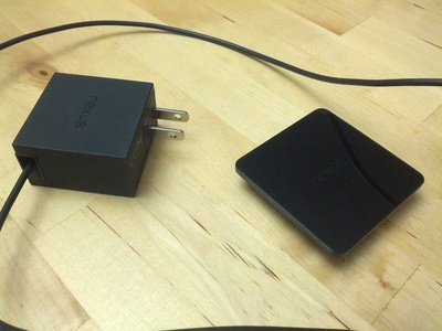 The photo above shows the Nexus Wireless Charger components. The is the wireless charging block, the AC adapter block, and the AC cable. As you can see, the theme is black. The AC adapter is really a standard USB AC adapter with a standard USB interface (see photo below). The cable is really just a micro-USB cable. Both components are easy replaceable parts. In addition, you can simply the wireless charging block into a computer using this cable, rather than the AC adapter.